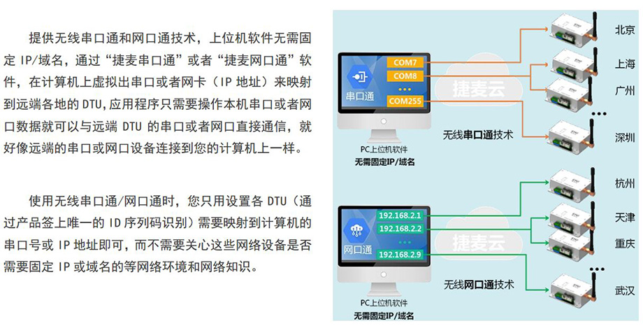 提供无线串口通网口通技术,计算机上虚拟出串口或IP映射DTU,远端DTU如同本地串口网口