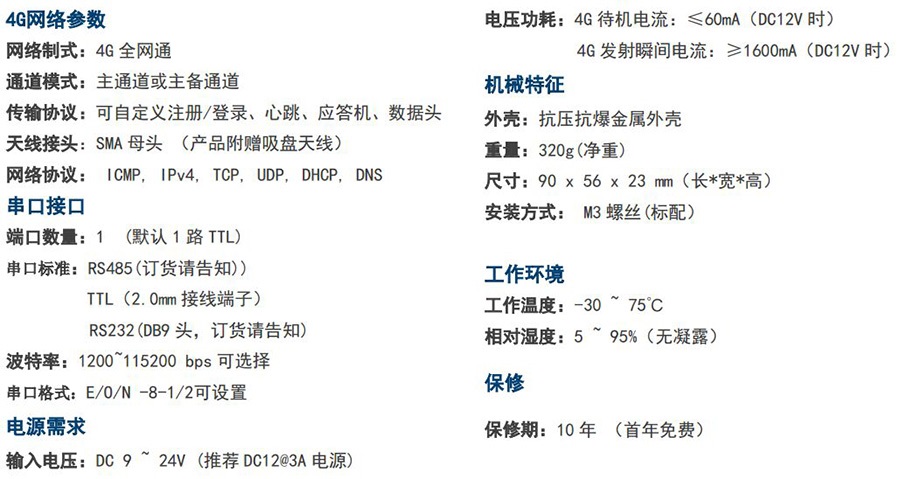 产品选型| 序号 | 型号 | 4G全网通 | 串口 | 以太网口 | 全球定位 | 自定义协议 | MODBUS协议转换 | 无线串口通/网口通 |