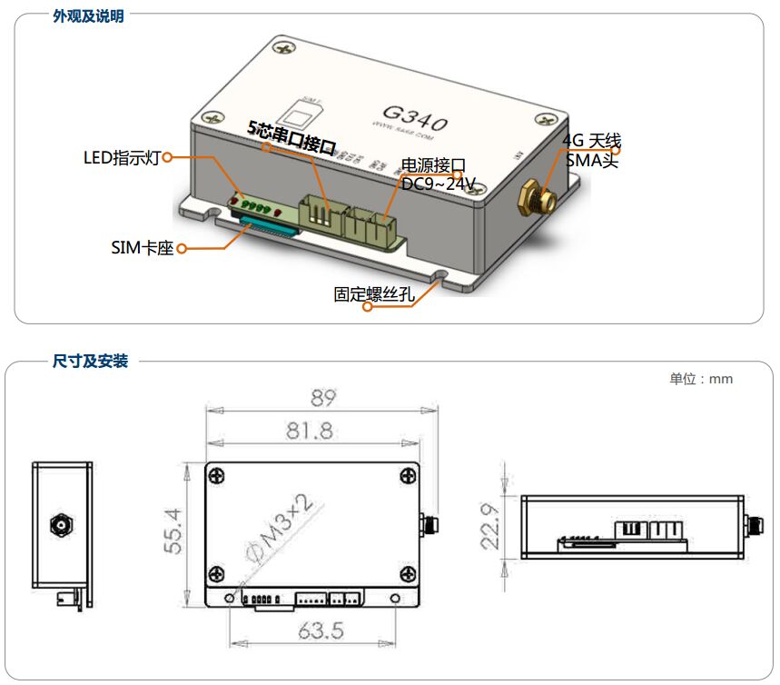 串口数据与4G网络数据双向透明传输,同时支持用户通过串口向手机等发送和接收短信。