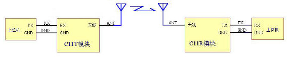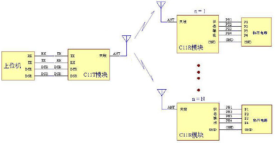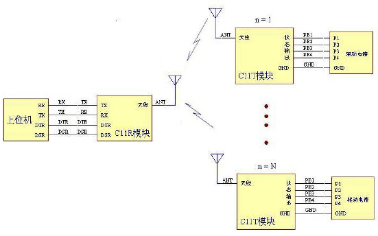 | 一发一收的应用模式在下面的领域中有广泛应用。其一是可视的遥控及有其他的反馈途径的的遥控领域。如天车遥控,机器人控制、可视监控系统的云台控制等。其二是:单向发送的各种状态数据的传输。如高炉温度、衡器的称重重量、气球上的气象参数采集等。连接关系见下图 |