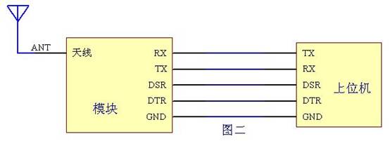 | 数传模块扩展功能是在基本数传功能的基础上增加了一些组网常用的命令设置功能。因为基本数传功能是透明传输的,而命令与数据又都是通过串口在上位机与模块间传递的,所以在硬件连接上使用扩展功能时增加了两条区分命令与数据的信号线DSR与DTR。连接图见图二。 |