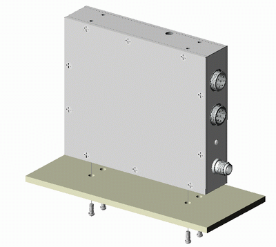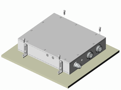 其二是用随机附带的固定角安装在底板上(随机带有固定角与壳体连接的螺丝),安装示意图如下:下底板打四个孔与模块尺寸对应,将螺丝由上向下穿入拧好。