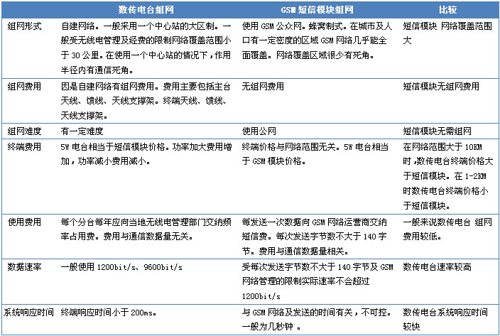G100A短信模块广泛应用于石油、水文、气象、市政等领域的自动化控制。在应用中用户往往在使用GSM模块组网与使用数传电台组网两种方案中举棋不定,下表列出了两种组网形式各自的特点,以便用户在选择组网方式时参考。